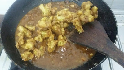 - Now you'll get semi gravy look. At this stage add a pinch of sugar and fried cauliflower and give a nice mix and simmer it for 5 min.